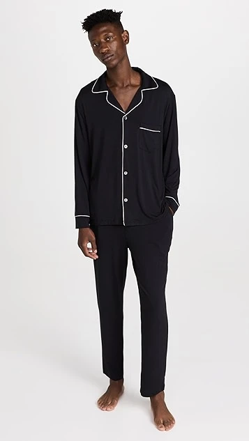 An Eberjey pajama set, rendered in soft jersey and trimmed with contrast piping for a classic, vintage-inspired touch. A notched collar frames the buttoned placket on the long-sleeved top, and the coordinating pants have a covered elastic waist.