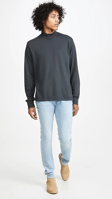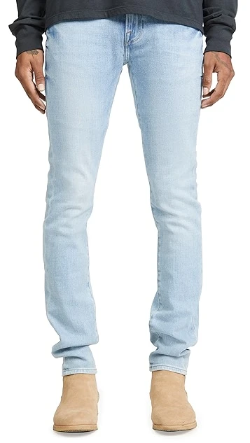 A pair of FRAME skinny jeans in a light wash, which is lightened even further through the use of heavy fading.
