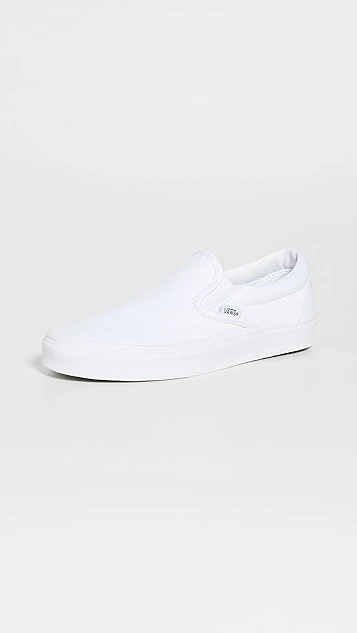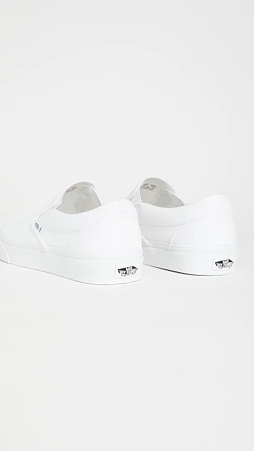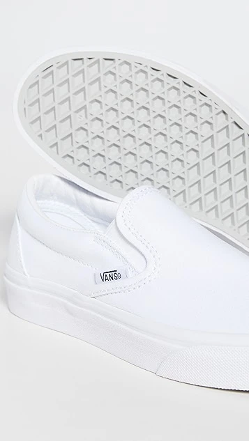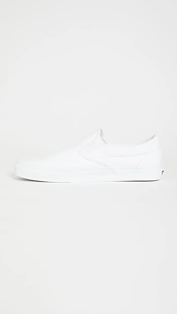 Bright-white canvas brings an understated look to these comfortable and classic Vans UA slip-on sneakers. A logo tag and heel patch add a signature finish.